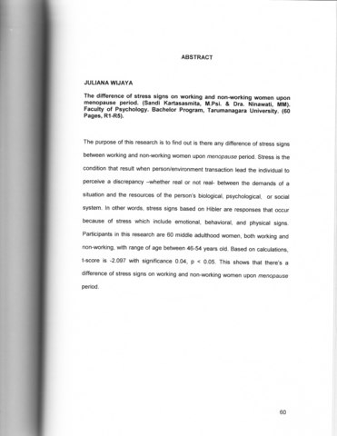 "The difference of stress signs on working and non-working women upon menopause period. (Sandi Kartasasmita, M.Psi. & Dra. Ninawati, MM). Faculty of Psychology. Bachelor Program, Tarumanagara University. (60 Pages, R1-R5).
