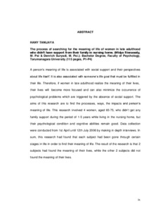 A person's meaning of life is associated with social support and their perspectives about life itself. It is also associated with someone’s life goal that must be fulfilled in their life. Therefore, if women in late adulthood realize the meaning of their lives, their lives will become more focused and can also minimize the occurrence of psychological problems which are triggered by the absence of social support. The aims of this research are to find the processes, ways, the impacts and person’s meaning of life. This research involved 4 women, aged 65-75, who didn't get any family support during the period of 1-5 years while living in the nursing home, but their psychological condition and cognitive abilities remain good. Data collection were conducted from 1st April until 12th July 2006 by making in depth interviews. In sum, this research had found that each subject had been gone through certain stages in life in order to find their meaning of life. The result of the research is that 2 subjects had found the meaning of their lives, while the other 2 subjects did not found the meaning of their lives.