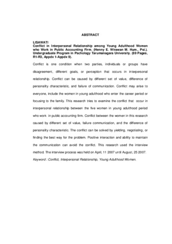 Conflict is one condition when two parties, individuals or groups have disagreement, different goals, or perception that occurs in interpersonal relationship. Conflict can be caused by different set of value, difference of personality characteristic, and failure of communication. Conflict may arise to everyone, include the women in young adulthood who enter the career period or focusing to the family. This research tries to examine the conflict that occur in interpersonal relationship between the five women in young adulthood period who work in public accounting firm. Conflict between the women in this research caused by different set of value, failure communication, and the difference of personality characteristic. The conflict can be solved by yielding, negotiating, or finding the best way for the problem. Positive interaction and ability to maintain the communication can avoid the conflict. This research used the interview method. The interview process was held on April, 11 2007 until August, 25 2007.