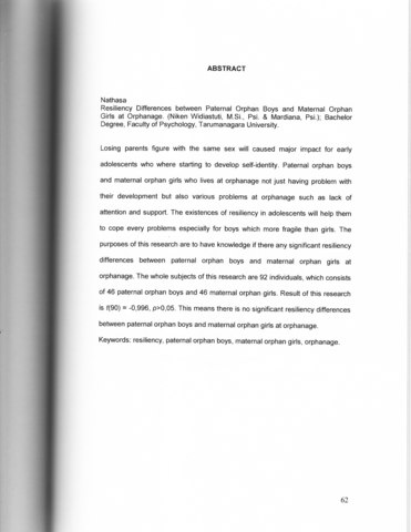 Nathasa, Nathasa (2007) Perbedaan resiliensi antara remaja putra yatim dan remaja piatu di Panti Asuhan. Skripsi thesis, Universitas Tarumanagara.