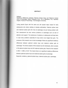 Losing parents figure with the same sex will caused major impact for early adolescents who where starting to develop self-identity. Paternal orphan boys and maternal orphan girls who lives at orphanage not just having problem with their development but also various problems at orphanage such as lack of attention and support. The existences of resiliency in adolescents will help them to cope every problems especially for boys which more fragile than girls. The purposes of this research are to have knowledge if there any significant resiliency differences between paternal orphan boys and maternal orphan girls at orphanage. The whole subjects of this research are 92 individuals, which consists of 46 paternal orphan boys and 46 maternal orphan girls. Result of this research is t(90) = -0,996, p>0,05. This means there is no significant resiliency differences between paternal orphan boys and maternal orphan girls at orphanage. Keywords: resiliency, paternal orphan boys, maternal orphan girls, orphanage.