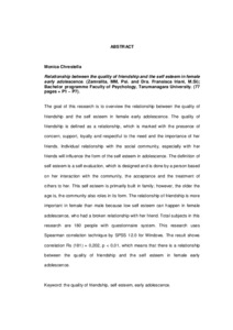 The goal of this research is to overview the relationship between the quality of friendship and the self esteem in female early adolescence. The quality of friendship is defined as a relationship, which is marked with the presence of concern, support, loyalty and respectful to the need and the importance of her friends. Individual relationship with the social community, especially with her friends will influence the form of the self esteem in adolescence. The definition of self esteem is a self evaluation, which is designed and is done by a person based on her interaction with the community, the acceptance and the treatment of others to her. This self esteem is primarily built in family; however, the older the age is, the community also roles in its form. The relationship of friendship is more important in female than male because low self esteem can happen in female adolescence, who had a broken relationship with her friend. Total subjects in this research are 180 people with questionnaire system. This research uses Spearman correlation technique by SPSS 12.0 for Windows. The result shows correlation Rs (181) = 0,202, p < 0,01, which means that there is a relationship between the quality of friendship and the self esteem in female early adolescence.