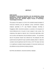 The purpose of this research is to find out the correlation between perception of Intercultural Sensitivity and job satisfaction among multinational company employee, specifically on PT. Jaya Readymix employees. According to Panggabean (2003), intercultural sensitivity is a sensitivity to the importance of cultural differences and to the point of view of people in other cultures. This competency have played an important role in intercultural relationships, which can be used as self adjustment and job satisfaction predictor. The quantitative data for this particular research was collected from 100 employees that were questionnaired and gathered through accidental sampling. Based on Spearman correlation test with significance level 0.05, show p >0.05. This means that there is no significance correlation between perception of intercultural sensitivity and job satisfaction among multinational company employee.
