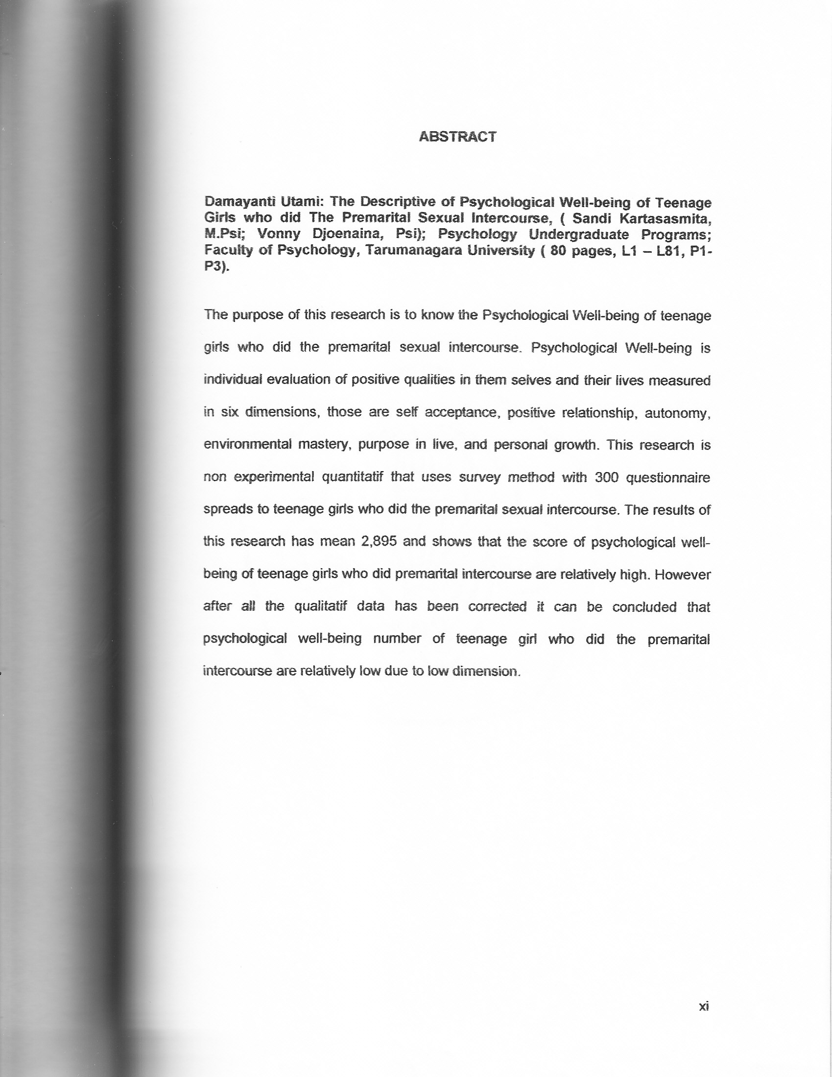 Utami, Damayanti (2007) Gambaran psychological well-being pada remaja yang melakukan hubungan seks pranikah. Skripsi thesis, Universitas Tarumanagara.