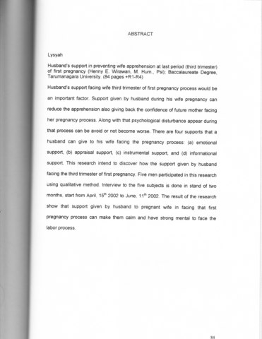 Husband's support facing wife third trimester of first pregnancy process would be an important factor. Support given by husband during his wife pregnancy can reduce the apprehension also giving back the confidence of future mother facing her pregnancy process. Along with that psychological disturbance appear during that process can be avoid or not become worse. There are four supports that a husband can give to his wife facing the pregnancy process: (a) emotional support, (b) appraisal support, (c) instrumental support, and (d) informational support. This research intend to discover how the support given by husband facing the third trimester of first pregnancy. Five men participated in this research using qualitative method. Interview to the five subjects is done in stand of two months_ start from April_ 15th 2002 to June. 11th 2002. The result of the research show that support given by husband to pregnant wife in facing that first pregnancy process can make them calm and have strong mental to face the labor process.