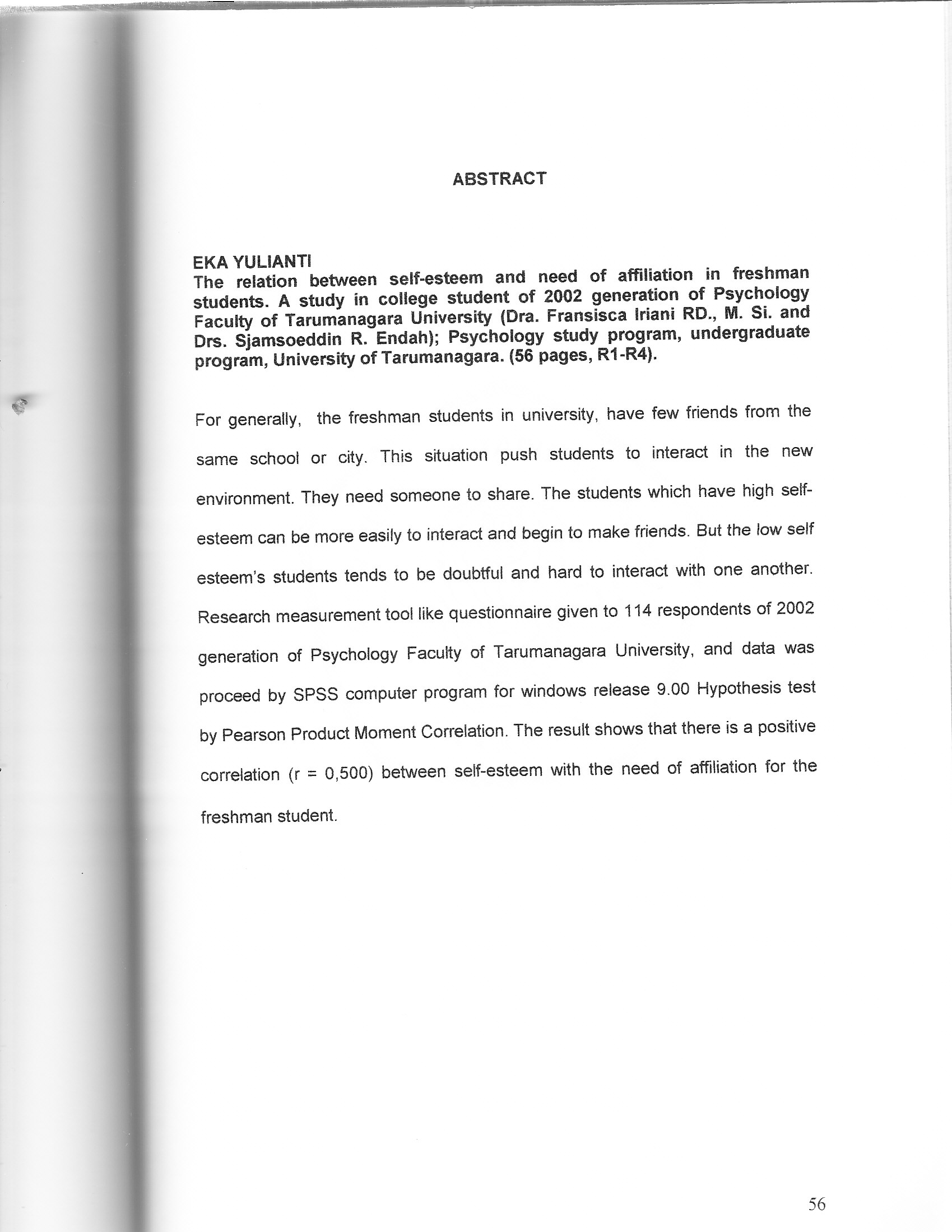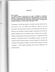 For generally, the freshman students in university, have few friends from the same school or city. This situation push students to interact in the new environment. They need someone to share. The students which have high self-esteem can be more easily to interact and begin to make friends. But the low self esteem's students tends to be doubtful and hard to interact with one another. Research measurement tool like questionnaire given to 114 respondents of 2002 generation of Psychology Faculty of Tarumanagara University, and data was proceed by SPSS computer program for windows release 9.00 Hypothesis test by Pearson Product Moment Correlation. The result shows that there is a positive correlation (r = 0,500) between self-esteem with the need of affiliation for the freshman student.