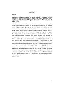 Gender identity disorder is one of the abnormal problems which are faced by parents and their children. According to the psychologist, gender identity disorder can be seen in early childhood. The inappropriate parenting style may have the significant influences to gender disorder of early childhood from beginning of their ages until they become adolescent. This aim of research is to describe the parenting style for gender identity’s formation in male transsexual. This method in depth interview which involved 4 transsexuals those 20 – 45 years and has been experiencing the gender identity disorder for 2 years. The interview was held for two months, started from November 2005 until December 2005. This research indicates that permissive parenting style give the significant influence bigger than another parenting style for gender identity disorder to the respondent because the result of this research shows 3 of 4 respondents are parented by permissive parenting style.