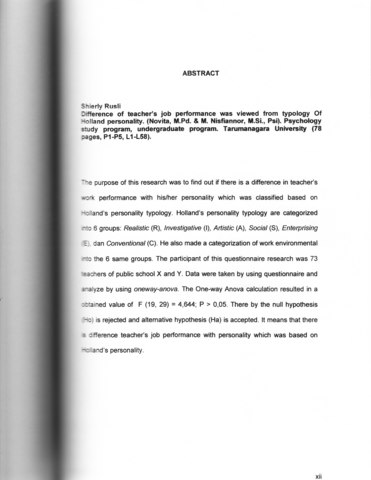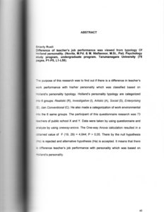 Work performance with his/her personality which was classified based on - Holand's personality typology. Holland's personality typology are categorized into 6 groups: Realistic (R), Investigative (I), Artistic (A), Social (S), ( (E)Enterprising dan Conventional (C). He also made a categorization of work environmental into he 6 same groups. The participant of this questionnaire research was 73 Teachers of public school X and Y. Data were taken by using questionnaire and analyze by using oneway-anova. The One-way Anova calculation resulted in a obtained value of F (19, 29) = 4,644; P > 0,05. There by the null hypothesis (Ho) is rejected and alternative hypothesis (Ha) is accepted. It means that there difference teacher's job performance with personality which was based on Holand’s personality.
