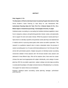 Individual career counseling is a counseling that facilitate individual capability to learn how to recognize, analyze, and performing potential, interest, values, and personality trait to support the work and career choices. While the purpose of career planning in high school is to develop a specific and systematic career planning to be implemented in realistic actions in pursuing career goals under career counsellor supervision. This research is a qualitative research aims to make a description about the process of career counseling given to a 16-years-old female adolescence in her third year of high school with authoritarian parents. Subject was given an individual career counseling intervention divided in three sessions with 100 minutes duration every session and delivered in three different days. After all the sessions done, there were four career choices that were found appropriate with subject individuality, and a design of career planning. With the counsellor supervision, subject undergo concrete steps according to career planning design until subject entered a faculty of Broadcasting in a university that support her career choice as a broadcaster.