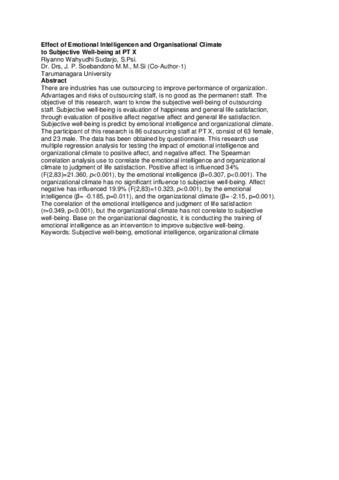 There are industries has use outsourcing to improve performance of organization. Advantages and risks of outsourcing staff, is no good as the permanent staff. The objective of this research, want to know the subjective well-being of outsourcing staff. Subjective well-being is evaluation of happiness and general life satisfaction, through evaluation of positive affect negative affect and general life satisfaction. Subjective well-being is predict by emotional intelligence and organizational climate. The participant of this research is 86 outsourcing staff at PT X, consist of 63 female, and 23 male. The data has been obtained by questionnaire. This research use multiple regression analysis for testing the impact of emotional intelligence and organizational climate to positive affect, and negative affect. The Spearman correlation analysis use to correlate the emotional intelligence and organizational climate to judgment of life satisfaction. Positive affect is influenced 34% (F(2,83)=21.360, p<0.001), by the emotional intelligence (β=0.307, p<0.001). The organizational climate has no significant influence to subjective well-being. Affect negative has influenced 19.9% (F(2,83)=10.323, p<0.001), by the emotional intelligence (β= -0.185, p=0.011), and the organizational climate (β= -2.15, p=0.001). The correlation of the emotional intelligence and judgment of life satisfaction (r=0.349, p<0.001), but the organizational climate has not correlate to subjective well-being. Base on the organizational diagnostic, it is conducting the training of emotional intelligence as an intervention to improve subjective well-being.