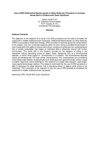 The objective of this research is to study if the DRO procedure can be used to increase the social skill in middle childhood Down Syndrome. Differential Reinforcement of Other behavior (DRO) is a procedure of behavior therapy. DRO procedure is done by giving the reinforcement to the subject, only if an unwanted response does not occur during a predetermined length of time. Social skill is the ability to interact with others, contains of verbal and non-verbal behavior that is socially acceptable, that makes an individual able to effectively interact with his/her environment. The social skill in this research focused on the behavior of sitting in the classroom without disturbing others or object. Down Syndrome (DS) is a chromosomal disorder, in which three copies of chromosome 21 is present. The chromosomal disorder results all individual with DS have similar characteristics. The characteristics are considered to be intellectually disable, and physically have small eyes with epicanthal folds, simian crease on palms, hypotonia, and a small figure. The research is a single case research, used single-case experimental design method. The research confirmed that the use of DRO procedure is able to decrease the target behavior, that is disturbing others or objects while sitting in the classroom. The conclusion of the research is that the use of DRO procedure increased the social skill in middle childhood Down Syndrome.