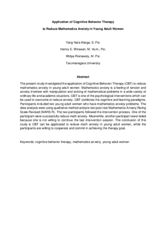 The present study investigated the application of Cognitive Behavior Therapy (CBT) to reduce mathematics anxiety in young adult women. Mathematics anxiety is a feeling of tension and anxiety interfere with manipulation and solving of mathematical problems in a wide variety of ordinary life and academic situations. CBT is one of the psychological interventions which can be used to overcome or reduce anxiety. CBT combines the cognitive and learning paradigms. Participants included two young adult women who have mathematics anxiety problems. The data analysis were using qualitative method and pre-test post-test Mathematics Anxiety Rating Scale-Revised (MARS-R). The two participants followed the intervention process. One of the participant were successfully reduce math anxiety. Meanwhile, another participant were failed because she is not willing to continue the last intervention session. The conclusion of this study is CBT can be applicated to reduce math anxiety in young adult women, while the participants are willing to cooperate and commit in achieving the therapy goal.