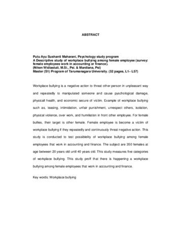 Workplace bullying is a negative action to threat other person in unpleasant way and repeatedly to manipulated someone and cause pyschological damage, physicall health, and economic secure of victim. Example of workplace bullying such as, teasing, intimidation, unfair punishment, unrespect others, isolation, physical violence, over work, and humiliation in front other employee. For female bullies, their target is other female. Female employee is become a victim of workplace bullying if they repeatedly and continuously threat negative action. This study is conducted to test possiblelity of workplace bullying among female employees that work in accounting and finance. The subject are 350 females at age between 20 years old until 40 years old. This study measures five categories of workplace bullying. This study proff that there is happening a workplace bullying among female employees that work in accounting and finance.