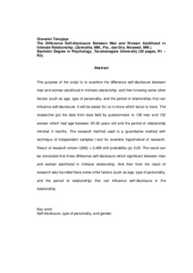 The purpose of the script is to examine the difference self-disclosure between man and woman adulthood in intimate relationship, and then knowing some other factors (such as age, type of personality, and the period of relationship) that can influence self-disclosure. It will be easier for us to know which factor is more. The researcher got the data from data field by questionnaire to 138 man and 132 woman which had age between 20-28 years old and the period of relationship minimal 3 months. The research method used is a quantitative method with technique of independent samples t-test for examine hypothetical of research. Result of research shown t(268) = 2,489 with probability (p) 0,05. The result can be concluded that there difference self-disclosure which significant between man and woman adulthood in intimate relationship. And then from the result of research also founded there some other factors (such as age, type of personality, and the period of relationship) that can influence self-disclosure in the relationship.
