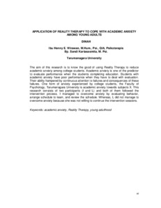 The aim of this research is to know the good of using Reality Therapy to reduce academic anxiety among college students. Academic anxiety is one of the predictor to evaluate performance when the students completing education. Students with academic anxiety have poor performance when they have to deal with evaluation. Their ability hampered by continuous attention to failures and consequences of these failures. One form of anxiety experienced by college students, the Faculty of Psychology, Tarumanagara University is academic anxiety towards subjects X. This research consists of two participants (I and L) and both of them followed the intervention process. I managed to overcome anxiety by evaluating behavior, arrange schedule to learn, and review the schedule. Whereas, L did not manage to overcome anxiety because she was not willing to continue the intervention sessions.