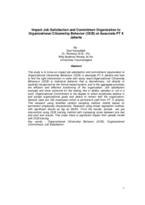 This study is to know an impact job satisfaction and commitment organization to Organizational Citizenship Behaviour (OCB) in assosiate PT X Jakarta and how to find the right intervension in order with study result.Organizational Citizenship Behaviour (OCB) is Individual behavior that is discretionary, not directly or explicitly recognized by the formal reward system, and in the aggregate promotes the efficient and effective functioning of the organization. Job satisfaction evaluate and show someone for the feeling, like or dislike, satisfact or not in a work. Organizational Commitment is the degree to which employees believe in and accept organizational goals and desire to remain with the organization. Sample used are 162 employees which is permanent staff from PT. X Jakarta. This research using stratified random sampling method, stratify based on permanent employees characteristic. Research using liniear regression method, with significant results as big as 69,8%. From the results, sample are got intervention using OCB training method with increasing score between pra test and post test results. This mean there is significant impact from people model with OCB training.
