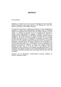 This research was carried out to observe the influence of trust in management on readiness to change using Leader-Member Exchange (LMX) as moderator variable. The participants of this research were 201 officials of Agency X in South Jakarta. To observe the influence of trust in management on readiness to change, certain measurements of readiness to change, LMX and trust in management were distributed to the participants. Regression analysis had been deployed as the chosen technique to analyse the main data. The analysis unveiled the influence of trust in management on readiness to change. Similar result had also been gained at the analysis on high LMX group. On the lower LMX group, it was expected the absence of influence of trust in management on readiness to change. However, the research had found the contrary facts, even with the higher contribution score. The dimension of trust in management that significantly influenced the readiness to change was capability. Intervention program had been done to lift up the level of trust amongst staff and management through workshop on trust building using appreciative inquiry. Such Intervention had inspired the staff that trust could be developed and it could be completed by positively promoting what they already had and what they had succeeded.