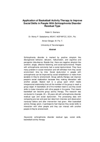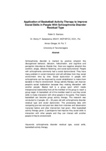 Schizophrenia disorder is marked by positive simptom like disorganized behavior, delusion, hallucination, and cognitive and perception disturbance. Beside that, there are negative simptom like avolition, alogia, affective flattening, and social dysfunctional. People with schizophrenia commonly had a social dysfunctional. They have many problem in social interaction and will withdraw from they social environment time by time. Social dysfunction in people with schizophrenia can be improved by social rehabilitation to make them sociable in they’re environment. Group activity therapy can improve people’s social dysfunction because they making interaction with another people. Basket ball is a group sport which needs interpersonal relationship from all the member of the group to reach a group target. In basketball, all of the member need to use they social skills to make interaction with other people in the game. That means basketball can become group activity therapy. The research was conducted to 2 people, 20 – 39 years old with schizophrenia disorder residual type and social dysfunction. The processing data with comparing pre-test and post-test data from interview and observation transcript before and after intervention had given. After basketball activity therapy given, 2 participants had improve they social skills to interaction with other people and they can interact with another people in they’re environment.