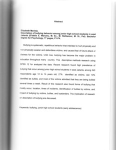 Bullying is systematic, repetitious behavior that intended to hurt physically and non-physically weaker and defendless victims, and caused fear of future attack or distress for the victims. Until now, bullying has become the major problem in education throughout many country. This descriptive methods research using SPSS 12 for analyzed the data. Recent research found high prevalence of bullying that occur among junior high school students in west Jakarta, among 345 respondents age 12 to 14 years old, 27% identified as victims, dan 10% .dentified as bullies, and most of the victims admitted that they are being bullied several times a week. Result of this research also found forms of bullying that mostly occur, location, times of incidents, identification of bullies by victims, and Impact of bullying by victims, bullies, and bystanders. The implication of reseach on description of bullying are discussed.