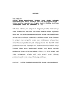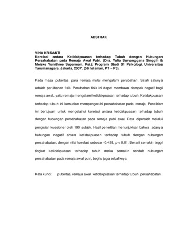 Krisanti, Vina (2007) Korelasi antara ketidakpuasan tubuh dengan hubungan persahabatan pada remaja awal putri. Skripsi thesis, Universitas Tarumanagara.