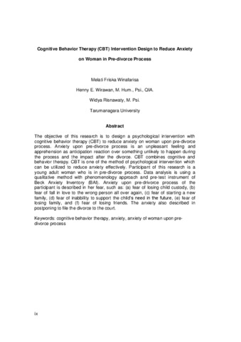 The objective of this research is to design a psychological intervention with cognitive behavior therapy (CBT) to reduce anxiety on woman upon pre-divorce process. Anxiety upon pre-divorce process is an unpleasant feeling and apprehension as anticipation reaction over something unlikely to happen during the process and the impact after the divorce. CBT combines cognitive and behavior therapy. CBT is one of the method of psychological intervention which can be utilized to reduce anxiety effectively. Participant of this research is a young adult woman who is in pre-divorce process. Data analysis is using a qualitative method with phenomenology approach and pre-test instrument of Beck Anxiety Inventory (BAI). Anxiety upon pre-drivorce process of the participant is described in her fear, such as: (a) fear of losing child custody, (b) fear of fall in love to the wrong person all over again, (c) fear of starting a new family, (d) fear of inabbility to support the child’s need in the future, (e) fear of losing family, and (f) fear of losing friends. The anxiety also described in postponing to file the divorce to the court.