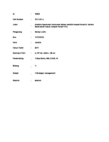 Lukito, Sandy (2011) Analisis keputusan konsumen dalam memilih tempat futsal di Jakarta Barat (studi kasus: tempat Futsal XYZ. Masters thesis, UNIVERSITAS TARUMANAGARA.