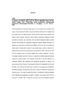 "The enhancement of financial need was one of the reason why recently there was so many dual-earner family. Dual-earner family means both of husband and wive working only for raising income/ money into their family. Many reaction from society about working women’s/ wive’s status, especially traditional society perception of gender role. Indirectly, this can affect husband’s attitude toward working wive’s status too, especially traditional husband. Beside perception of gender role, wive’s level of income may affect how far her role in providing the family needs. Traditionally, husband must provide basic economy needs for his family and wive must be a good mother and housewive. When wive earns more than her husband, than she will take bigger role in family, especially in finance. The bigger financial role she involved in, indirectly will affect husband’s attitude toward her working status. This research would like to see the difference of husband’s attitude with traditional and egalitarian perception of gender role toward wive’s level of income. This research involves 130 husbands from 25 until 39 years, with working wife which stay at Jakarta. The sample was collected by accidental sampling. Quessionare was used to collect the data and analized with oneway-anova. The result revealed that there is a difference husband’s attitude with traditional and egalitarian perception of gender role toward wive’s level of income (F = 55.899 ; Sig. = 0.000). By the result, we can see different attitude, especially between traditional husband with higher wive’s level of income and egalitarian husband with lower/ higher wive’s level of income.