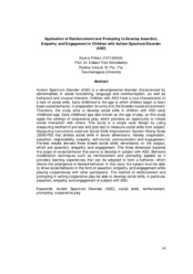 Priliani, Karina (2015) Penerapan reinforcement dan prompting untuk mengembangkan assertion, emphaty, dan engagement pada anak dengan autisim sprectrum disorder (ASD). Masters thesis, Universitas Tarumanagara.