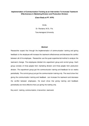 Andru, Andru (2015) Implementasi pelatihan komunikasi sebagai bentuk intervensi untuk meningkatkan efektivitas kerjasama pada divisi marketing dan divisi produksi (Studi kasus di PT. KFR). Masters thesis, Universitas Tarumanagara.