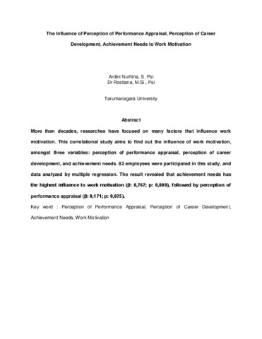 More than decades, researches have focused on many factors that influence work motivation. This correlational study aims to find out the influence of work motivation, amongst three variables: perception of performance appraisal, perception of career development, and achievement needs. 82 employees were participated in this study, and data analyzed by multiple regression. The result revealed that achievement needs has the highest influence to work motivation (β: 0,767; p: 0,000), followed by perception of performance appraisal (β: 0,171; p: 0,025).