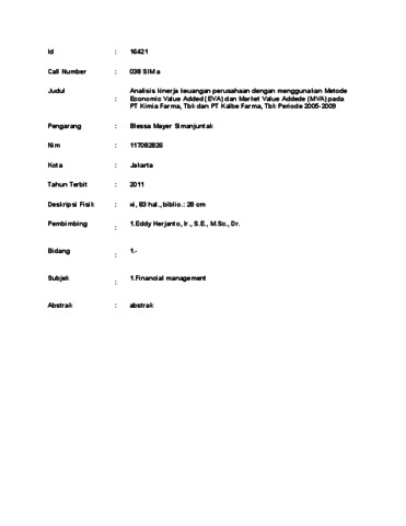 Simanjuntak, Blessa Mayer (2011) Analisis kinerja keuangan perusahaan dengan menggunakan Metode Economic Value Added (EVA) dan Market Value Addede (MVA) pada PT Kimia Farma, Tbk dan PT Kalbe Farma, Tbk Periode 2005-2009. Masters thesis, UNIVERSITAS TARUMANAGARA.