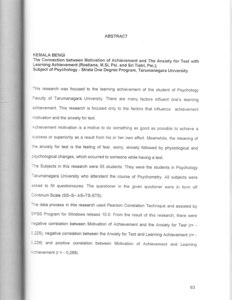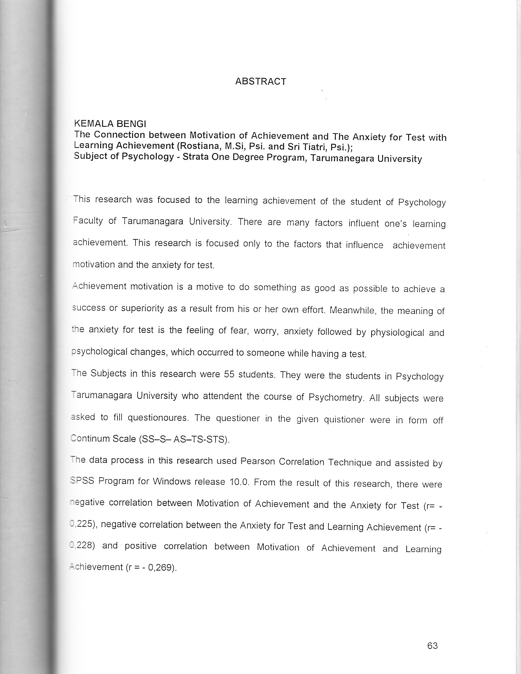 The data process in this research used Pearson Correlation Technique and assisted by SPSS Program for Windows release 10.0. From the result of this research, there were negative correlation between Motivation of Achievement and the Anxiety for Test (r= 2,225), negative correlation between the Anxiety for Test and Learning Achievement (r= 2228) and positive correlation between Motivation of Achievement and Learning achievement (r = - 0,269).