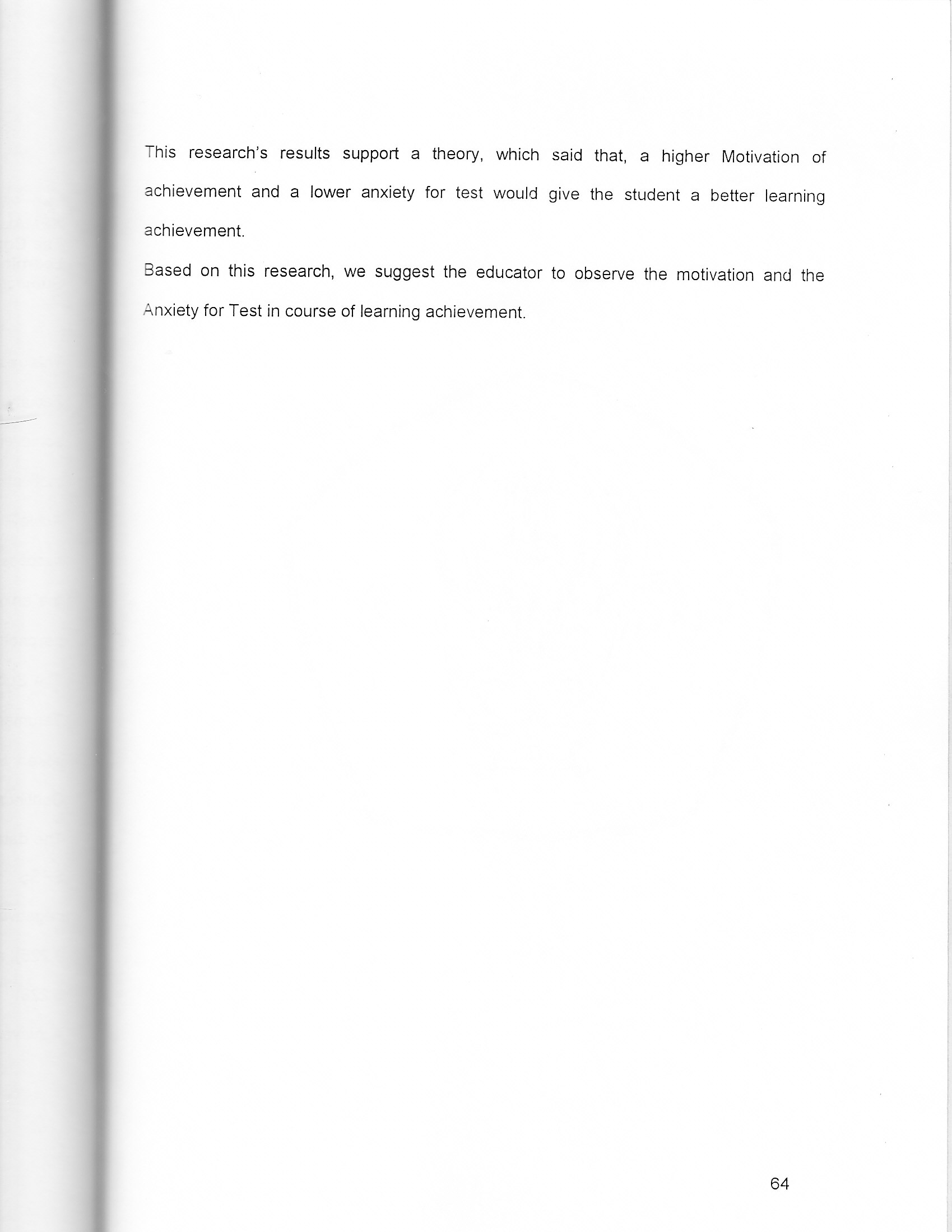 Based on this research, we suggest the educaor to observe the motivation and the anxiety for test in course of learning achievement