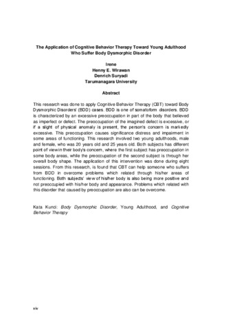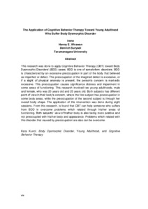 This research was done to apply Cognitive Behavior Therapy (CBT) toward Body Dysmorphic Disorders’ (BDD) cases. BDD is one of somatoform disorders. BDD is characterized by an excessive preoccupation in part of the body that believed as imperfect or defect. The preoccupation of the imagined defect is excessive, or if a slight of physical anomaly is present, the person’s concern is markedly excessive. This preoccupation causes significance distress and impairment in some areas of functioning. This research involved two young adulthoods, male and female, who was 20 years old and 25 years old. Both subjects has different point of view in their body’s concern, where the first subject has preoccupation in some body areas, while the preoccupation of the second subject is through her overall body shape. The application of this intervention was done during eight sessions. From this research, is found that CBT can help someone who suffers from BDD in overcome problems which related through his/her areas of functioning. Both subjects’ view of his/her body is also being more positive and not preoccupied with his/her body and appearance. Problems which related with this disorder that caused by preoccupation are also can be overcome.