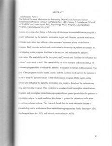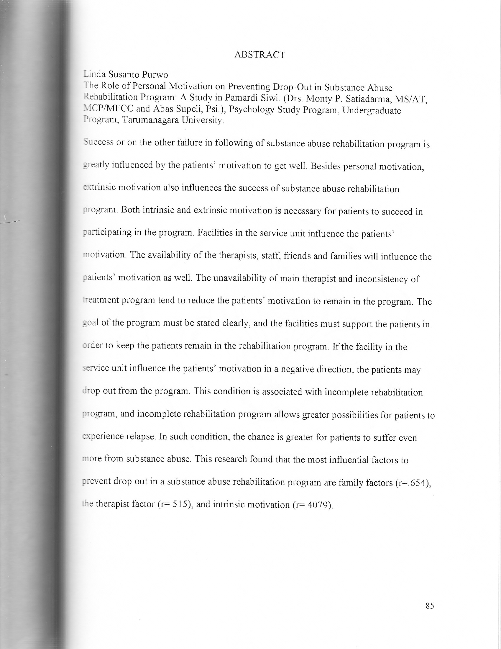 Success or on the other failure in following of substance abuse rehabilitation program is greatly influenced by the patients, motivation to get well. Besides personal motivation, extrinsic motivation also influences the success of sub stance abuse rehabilitation program. Both intrinsic and extrinsic motivation is necessary for patients to succeed in participating in the program. Facilities in the service unit influence the patients” motivation. The availability of the therapists, staff, friends and families will influence the patients” motivation as well. The unavailability of main therapist and inconsistency of treatment program tend to reduce the patients” motivation to remain in the program. The goal of the program must be stated clearly, and the facilities must support the patients in 1 order to keep the patients remain in the rehabilitation program. If the facility in the service unit influence the patients” motivation in a negative direction, the patients may drop out from the program. This condition is associated with incomplete rehabilitation program, and incomplete rehabilitation program allows greater possibilities for patients to experience relapse. In such condition, the chance is greater for patients to suffer even more from sub stance abuse. This research found that the most influential factors to prevent drop out in a sub stance abuse rehabilitation program are family factors (r=.654),he therapist factor (r=.515), and intrinsic motivation (r=.4079).
