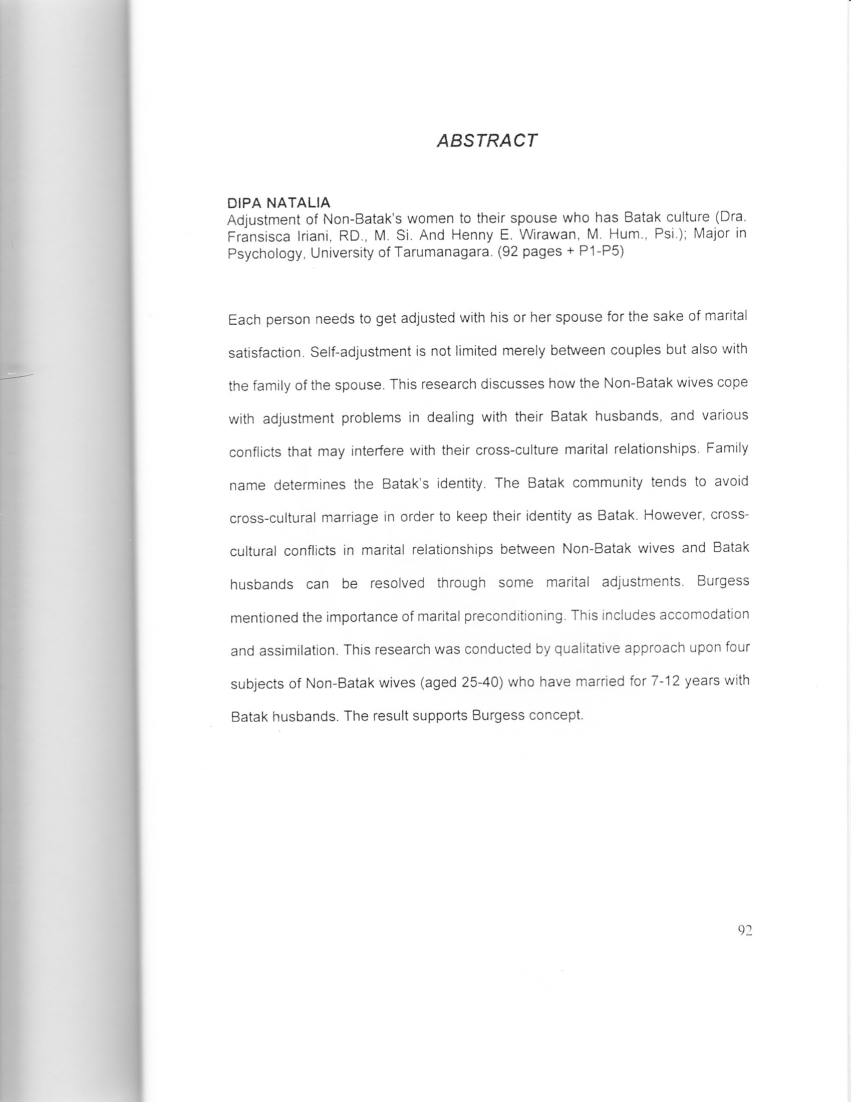 Natalia, Dipa (2001) Penyesuaian perempuan non-Batak terhadap pasangan hidupnya yang berbudaya Batak. Skripsi thesis, Universitas Tarumanagara.