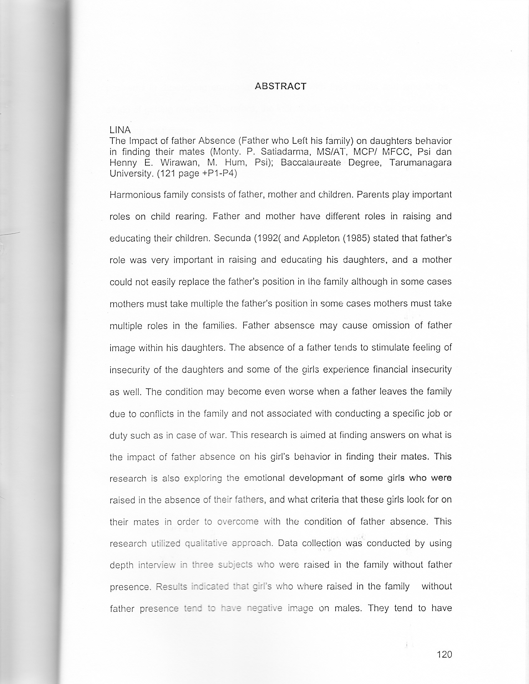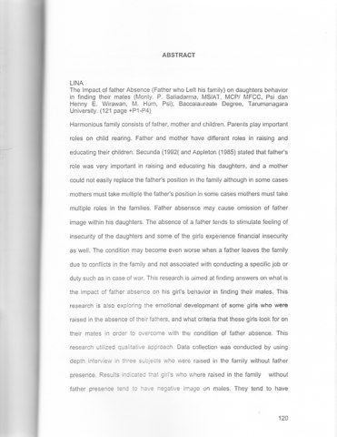 Lina, Lina (2001) Dampak ketiadaan ayah (ayah meninggalkan keluarga) terhadap pemilihan pasangan hidup seorang perempuan. Skripsi thesis, Universitas Tarumanagara.