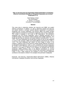 This study aims to determine whether job insecurity and OBSE can predict affective commitment. In addition, it is also to determine whether job insecurity can predict whether a stronger towards affective commitment on permanent employees than contract employees, and whether OBSE can predict stronger against affective commitment on permanent employees than contract employees. The number of samples in this study of 200 respondents, 100 permanent employees and 100 contract employees, using a sampling technique that is accidental sample. This research analysis method using multiple regression. The results showed that job insecurity can predict affective commitment (β: -0.514, p <0.01). The more employees are worried about losing his job the less delighted to remain in the company. OBSE can predict affective commitment (β: 0.326, p <0.01). The more employees feel valued, the more happy to remain in the company. Predictive value of job insecurity towards greater affective commitment on permanent employees (β: -0.557, p <0.01) compared with contract employees (β: -0.490, p <0.01). Worrying will lose their jobs in a more permanent employees contribute to the desire to remain in the company as compared with contract employees. OBSE predictive value of the affective commitment on contract employees (β: 0.408, p <0.01) more involved than permanent employees (β: 0.256, p <0.01). Taste valued by the company at more contract employees contribute to the Desire to remain in the company than permanent employees.