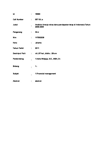 Silvi, Silvi (2011) Analisis kinerja reksa dana pendapatan tetap di Indonesia Tahun 2006-2009. Masters thesis, UNIVERSITAS TARUMANAGARA.