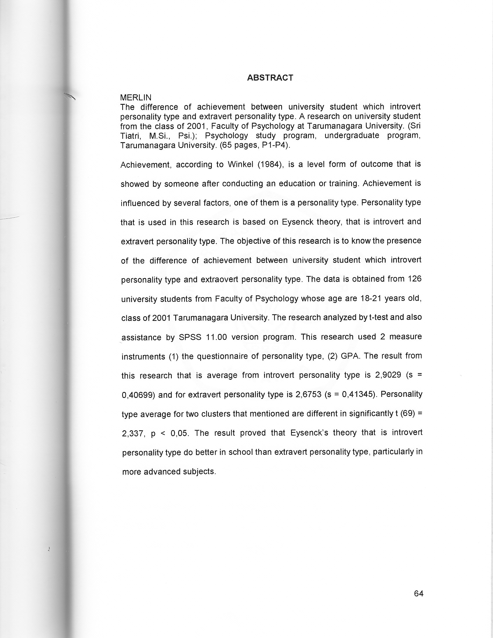 Achievement, according to Winkel (1984), is a level form of outcome that is showed by someone after conducting an education or training. Achievement is influenced by several factors, one of them is a personality type. Personality type that is used in this research is based on Eysenck theory, that is introvert and extravert personality type. The objective of this research is to know the presenceof the difference of achievement between university student which introvert personality type and extraovert personality type. The data is obtained from 126 , university students from Faculty of Psychology whose age are 18-21 years old, class of 2001 Tarumanagara University. The research analyzed by t-test and also assistance by SPSS 11.00 version program. This research used 2 measure instruments (1) the questionnaire of personality type, (2) GPA. The result from this research that is average from introvert personality type is 29029 (5 , 0,40699) and for extravert personality type is 26753 (3 = 0,41345). Personalitytype average for two clusters that mentioned are different in significantlyt (69)2,337, p < 0,05. The result proved that Eysenck's theory that is introvert personality type do better in school than extravert personality type, particularly in more advanced subjects.