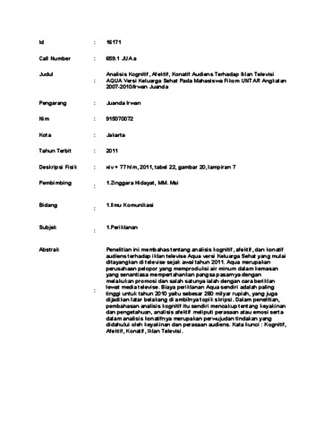 Irwan, Juanda (2011) Analisis Kognitif, Afektif, Konatif Audiens Terhadap Iklan Televisi AQUA Versi Keluarga Sehat Pada Mahasiswa Fikom UNTAR Angkatan 2007-2010/Irwan Juanda. Skripsi thesis, UNIVERSITAS TARUMANAGARA.
