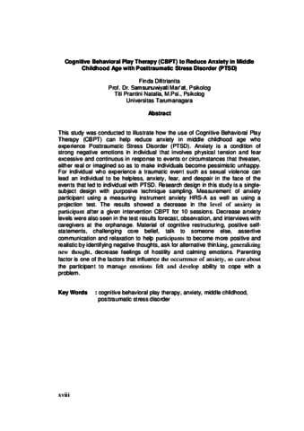 Diftrianita, Finda (2016) Cognitive behvioral play therapy (CBPT) untuk menurunkan kecemasan anak usia middle childhood dengan postrauma stress disorder (PTSD). Masters thesis, Universitas Tarumanagara.