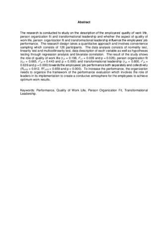 | Uncontrolled Keywords: | Performance, Quality of Work Life, Person Organization Fit, Transformational Leadership. |