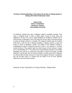 As individual, students have task or obligation related to academic activities. They have to complete those in order to obtain grade. Among of those tasks and obligations, the task of an oral or public speaking are avoided by students due to cause anxiety to themselves. One of the ways that can be used to overcome anxiety is using art therapy method i.e. mandala. This research method uses mix-method, which aims to see the role of drawing mandalas in helping students to cope with anxiety in terms of speaking in public. The subject of this research involving 3 undergraduate students. Measuring instrument used in this research is the Beck Anxiety Inventory. This research spent five months span of time, starting in August 2017 until December 2017. The results show that quantitative analysis of art therapy (Mandala) that used as an intervention was able to reduce the anxiety of public speaking. It can be seen from the results of decline in anxiety score which measured by using the Beck Anxiety Inventory on those three subjects. Whereas, in qualitative way can be seen there is a change from the results of the art work, behavior observation and intervention process.