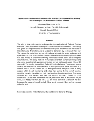 Junita, Gunawan Elisa (2014) Penerapan Rational Emotive Behavior Therapy (REBT) untuk Mengurangi Kecemasan dan Intensitas Trichotillomania pada Wanita Dewasa Muda. Masters thesis, Universitas Tarumanagara.