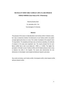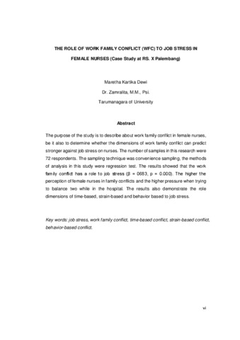 kartika Dewi, Maretha (2016) Peran work family conflict terhadap stres kerja pada perawat wanita (Studi kasus RS X Palembang). Masters thesis, Universitas Tarumanagara.
