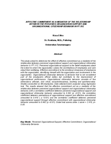 Elfira, Rizca (2016) Komitmen afektif sebagai mediator hubungan antara persepsi dukungan organisasi dengan perilaku kewargaan organisasional di PT XYZ. Masters thesis, Universitas Tarumanagara.
