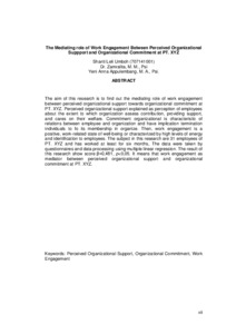 The aim of this research is to find out the mediating role of work engagement between perceived organizational support towards organizational commitment at PT. XYZ. Perceived organizational support explained as perception of employees about the extent to which organization assess contribution, providing support, and cares on their welfare. Commitment organizational is characteristic of relations between employee and organization and have implication termination individuals to fo its membership in organize. Then, work engagement is a positive, work-related state of well-being or characterized by high levels of energy and identification to employees. The subject in this research are 31 employees of PT. XYZ and has worked at least for six months, The data were taken by questionnaires and data processing using multiple linear regression. The result of this research show score β=0,481, p<0,05. It means that work engagement as mediator between perceived organizational support and organizational commitment at PT. XYZ.