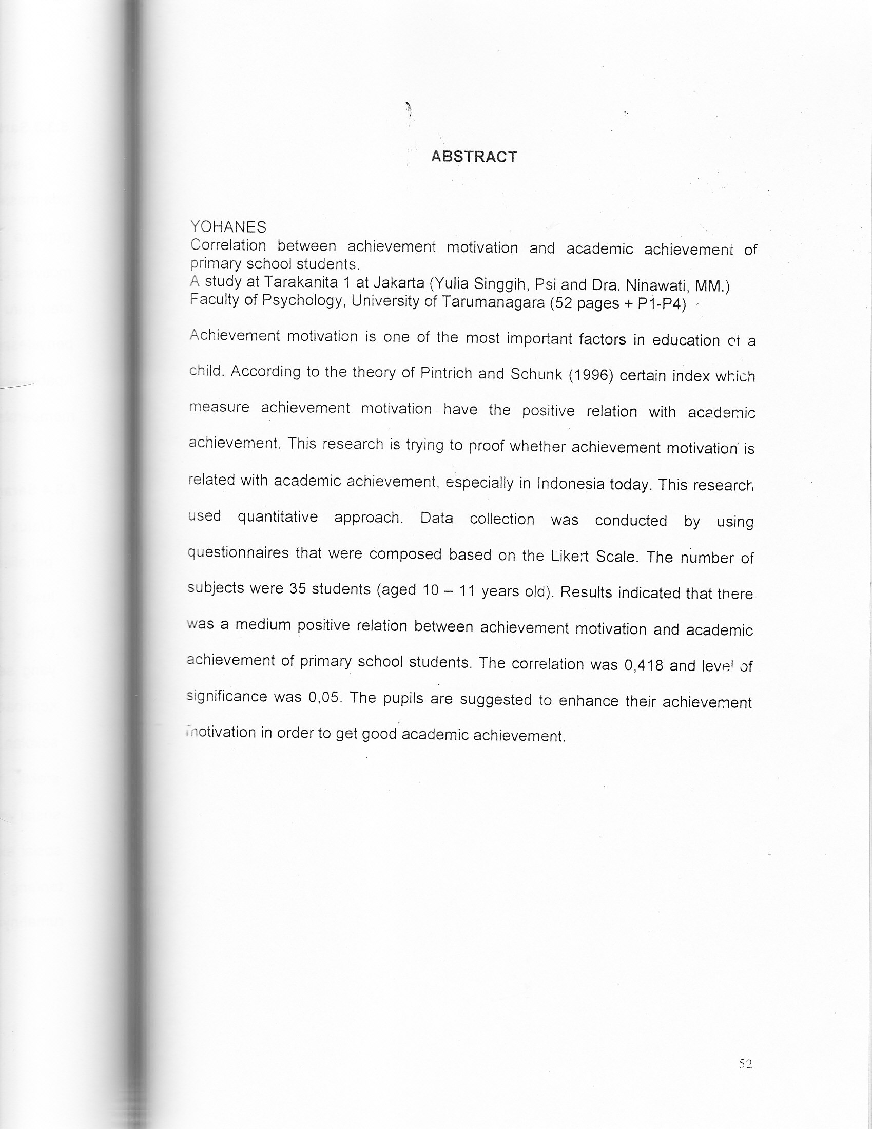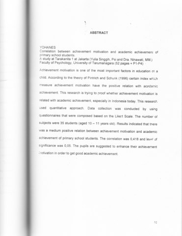 Achievement motivation is one of the most important factors in education ot a child. According to the theory of Pintrich and Schunk (1996) certain index which measure achievement motivation have the positive relation with academic achievement. This research is trying to proof whetherachievement motivation" is l related with academic achievement, especially in Indonesia today. This research used quantitative approach. ' Data collection was conducted by using questionnaires that were composed based on the Likert Scale. The number of subjects were 35 students (aged 10 - 11 years old). Results indicated that there was a medium positive relation between achievement motivation and academic achievement of primary school students. The correlation was 0,418 and level of significance was 0,05. The pupils are suggested to enhance their achievement Jnotivation in order to get good'academic achievement.