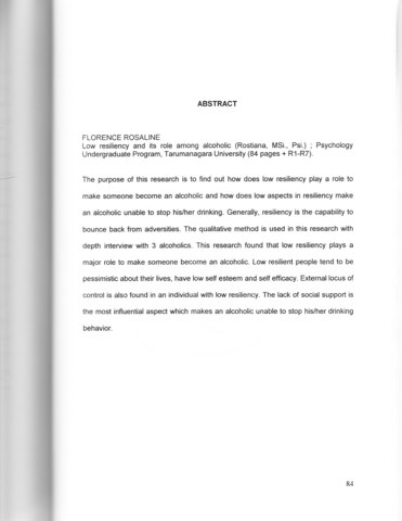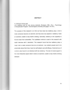 "The purpose of this research is to find out how does low resiliency play a role to make someone become an alcoholic and how does low aspects in resiliency make an alcoholic unable to stop his/her drinking. Generally, resiliency is the capability to